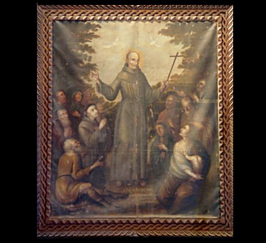 Lienzo lino. Técnica: Óleo sobre tela, marco tallado y sobredorado. Autor: Anónimo. Tema: Religioso. Medidas: 1.91 x 1.46 mts. Pintura del siglo: XVIII.