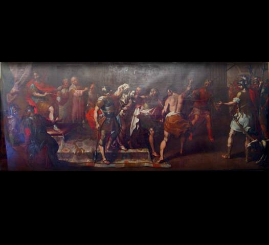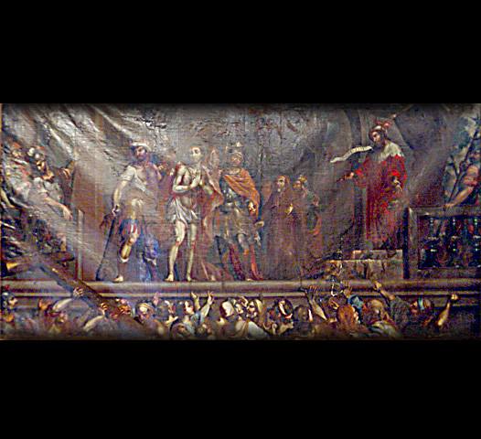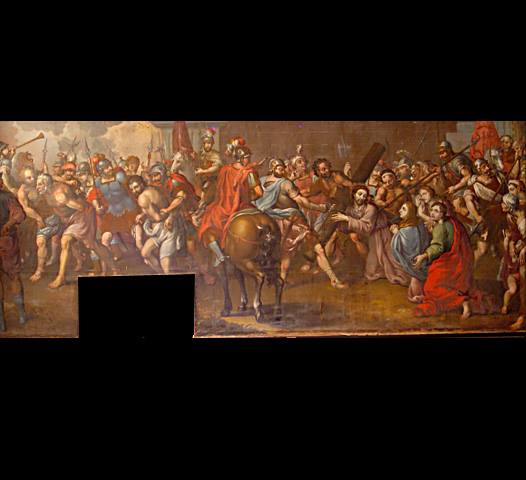 Lienzo lino. Técnica: Óleo sobre tela, madera dorado y negro. Autor: Anónimo. Tema: Religioso. Medidas: 2.46 x 1.69 mts. Pintura del siglo: XVII o XVIII.