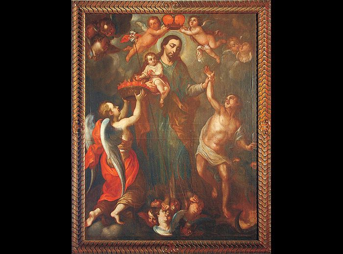 El museo de Arte Colonial de La Antigua Guatemala, pone a su disposición, en este espacio, parte de la colección de estas obras históricas que consisten en una Colección de Piezas Maestras, la Colección de Thomas de Merlo y la Colección de Cristóbal de Villalpando. Para ampliarlas, por favor haga click con el mouse en cada una de las representaciones artísticas.
