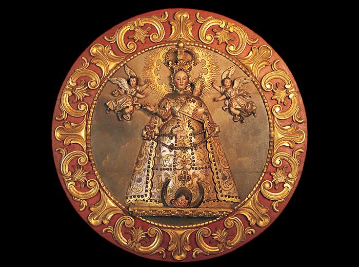 Material: Madera (cedro) •• Técnica: Talla, encarnada, bicroma, originalmente plateada, la parte externa del manto es dorada con labor de punzón en las zonas extremas del mismo. •• Autor: Anónimo •• Tema: Religioso •• Medidas: 1.71 x 1.71 mts. •• Medallón del Siglo: XVIII.